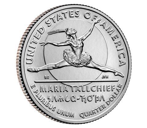 The coin’s reverse depicts Maria Tallchief spotlit in balletic pose, and her Osage name, which translates to “Two Standards,” written in Osage orthography. Additional inscriptions are “UNITED STATES OF AMERICA,” “E PLURIBUS UNUM,” “QUARTER DOLLAR,” and “MARIA TALLCHIEF.”